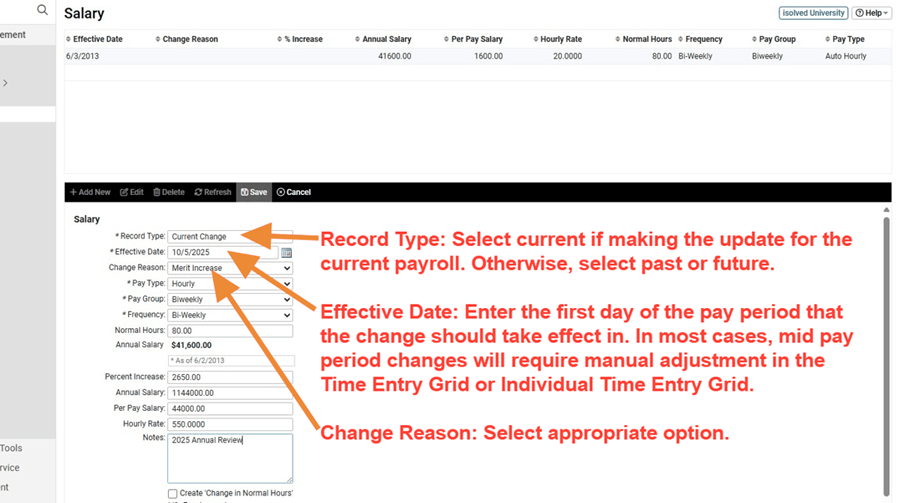- IF the record is WRONG and needs to be corrected, then Click "Edit" to fix the history and update the record. See next step if this is instead an official change or rate update.
